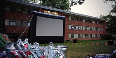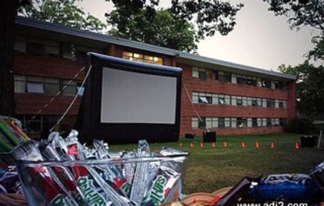 Our "Movies In The Outdoors" event is available in three different size and each size comes with our high impact sound system. Our video screens are the inflatable type and are designed to be used outside safely. Also, a FM transmitter can be provided so the sound can be broadcast to car radios. Music videos are played before the movie to get everyone in the mood.
